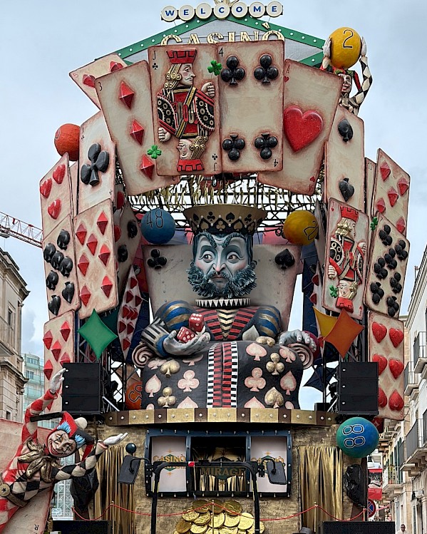 Quello che mi ha colpito non era solo il tema, purtroppo sempre più attuale, ma il modo in cui i maestri cartapestai avevano scelto di rappresentarlo. Il carro metteva in scena una medaglia con due facce perfettamente identiche. Normalmente, una moneta ha due lati opposti, testa e croce. In quel carro, invece, il disegno era lo stesso su entrambi i lati. Era un paradosso visivo che gridava un messaggio politico e sociale chiarissimo: quando si parla di gioco d’azzardo in Italia, il lato delle società private che gestiscono scommesse e slot machine e il lato dello Stato che dovrebbe regolamentare e proteggere i cittadini, sono in realtà la stessa identica faccia.