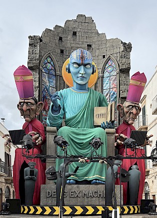 Il “Nuovo Messia Digitale” è un carro magnificamente realizzato, con una scenografia che lascia senza fiato. Più che un carro allegorico, è un’analisi visiva della nostra società: un’entità fatta di algoritmi e schermi che promette certezze assolute a una platea ipnotizzata, privata della propria capacità critica.